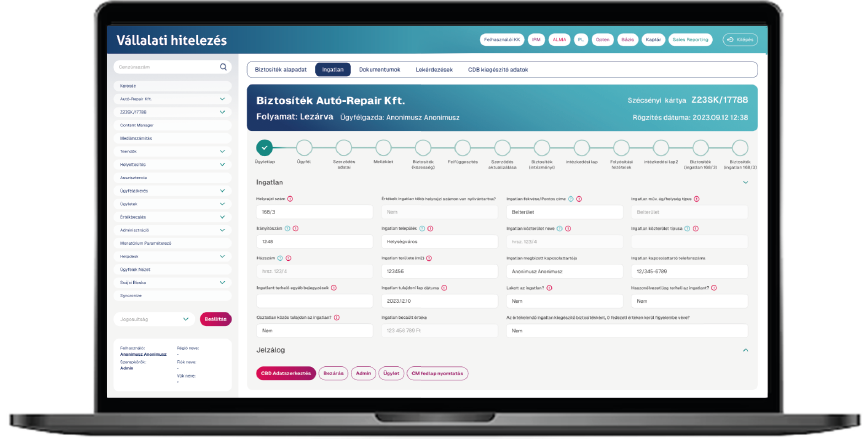 • Ügylet adatok, biztosítékok, ügyféladatok