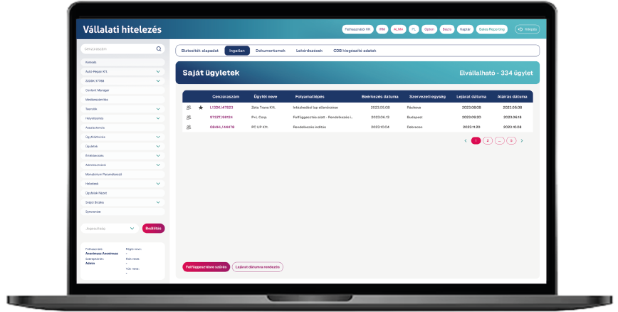 • Ügylet adatok, biztosítékok, ügyféladatok